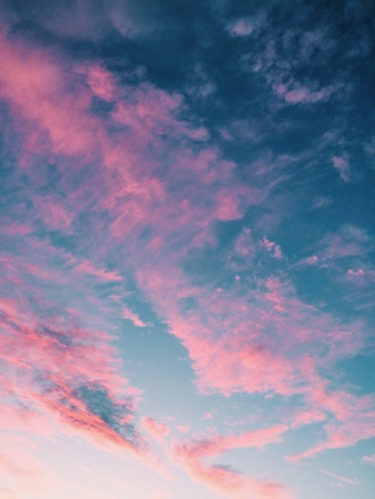 A captivating view of a serene sunset sky filled with fluffy clouds in shades of pink and orange against a calming blue backdrop, perfect for mood and inspiration.