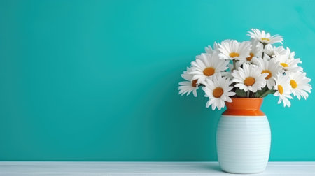 Daisy flowers bouquet in orange vase on white wooden coffee table near turquoise wall background. Interior design of modern living room