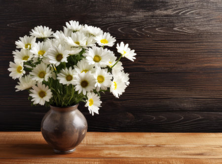 Daisies in white vase on wooden background