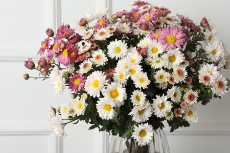 White chrysanthemum flower bouquet in vase. Spring composition with daisy flowers. Copy space for text