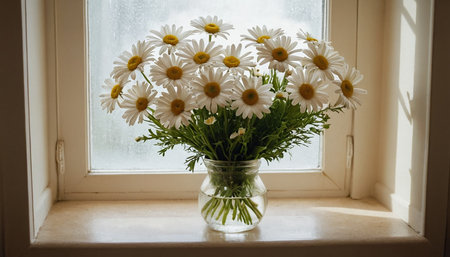 Bouquet of white daisies in a vase on the windowsill