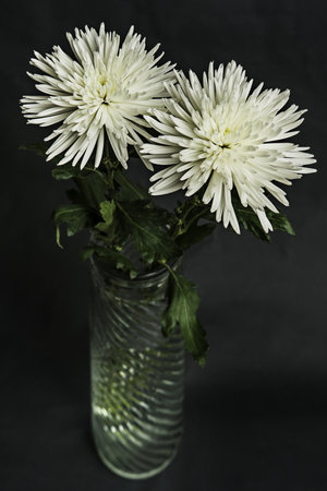 a bouquet of white chrysanthemums against a dark, monochromatic background, emphasizing the purity and grace of these flowers