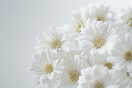White chrysanthemums on a white background with copy space