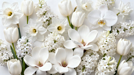 Beautiful white tulips and hyacinths on white background