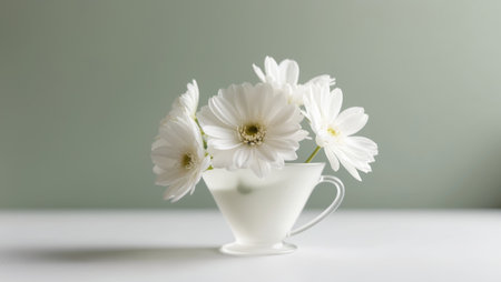 AI Generated. White Flowers in a Cup on Green Background
