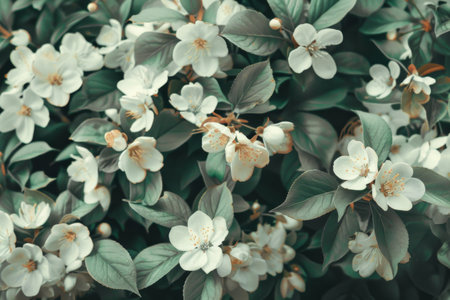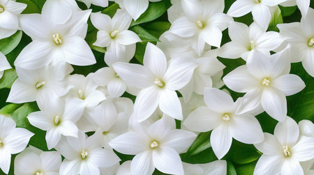 A close up of a bunch of white flowers with green leaves. Concept of freshness and vitality, as the flowers and leaves are vibrant and healthy