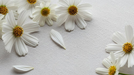Surface showing white daisy flowers and petals scattered on textured white fabric surface. resolution