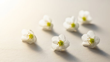 Drops showing six small delicate white wildflowers with yellow centers scattered on a light textured surface with soft sunlight and subtle shadows keywords: white...