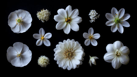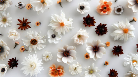 This vibrant image showcases a stunning variety of flowers artfully arranged on a light background, highlighting their intricate shapes and textures. Perfect for adding a touch of nature's beauty to any project.