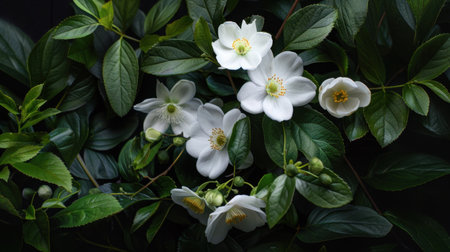 A stunning close-up of delicate white flowers nestled among rich green leaves, showcasing the beauty of nature. This serene arrangement evokes tranquility, ideal for various themes.