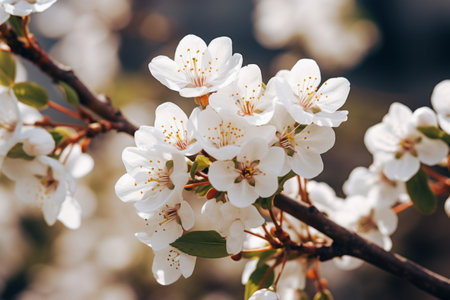 A captivating close-up view of delicate white cherry blossom flowers blooming softly in natural light, evoking feelings of tranquility and beauty in nature.