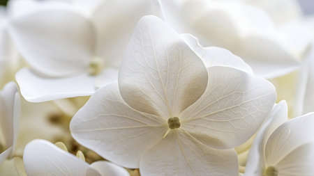 A detailed close-up image of delicate white hydrangea flowers, showcasing their intricate petals and soft texture. The flowers are clustered together, highlighting their natural beauty and gentle curves.
