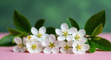 Close-up of a cluster of small white flowers with green leaves on a pink surface, creating a beautiful natural composition.