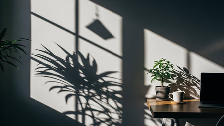 Sunlight streams in, casting sharp geometric shadows of plants and window panes across a white wall and a desk.