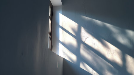 An interior shot features a corner with a window casting light across a wall. The interplay of light and shadow creates an abstract pattern. The composition emphasizes lines and shapes, resulting in a dramatic effect. Suitable for visual concepts and backgrounds.