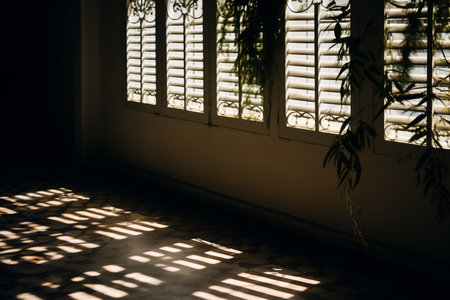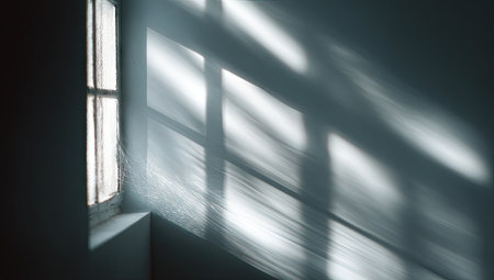Gentle rays filter through the window, forming delicate patterns of shadows on the wall. This tranquil moment evokes a sense of calm and quiet introspection during midday.