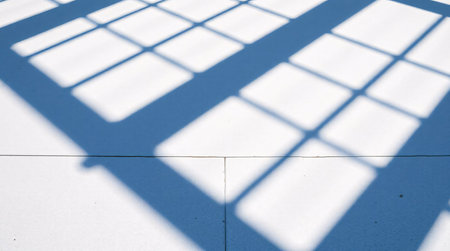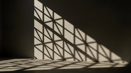 Beautiful geometric shadows created by sunlight filtering through a grid pattern, casting intricate designs on a soft pastel surface