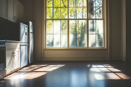 Empty room with natural light from a single, large window casting warm shadows across light wood flooring. Minimalist and calm.