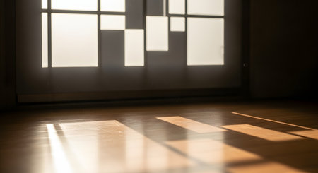 A serene indoor space featuring dynamic patterns created by sunlight streaming through windows, casting shadows on the wooden floor. The warm ambiance enhances the minimalist design, evoking a sense of tranquility and peacefulness. Perfect for use in projects focused on home decor, interior design, or calming environments.
