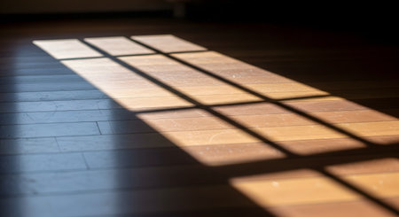 Bright sunlight casts a sharp, geometric grid shadow of a window onto a smooth wooden floor. The interplay of light and dark creates a warm, atmospheric, and minimalist composition ideal for background use.