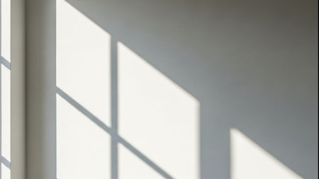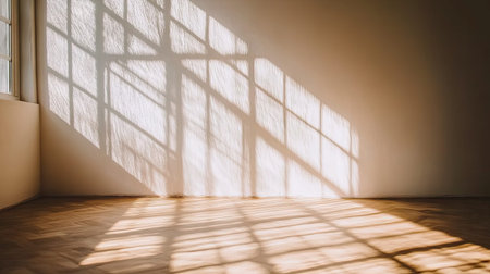 Soft natural light streaming through windows, casting gentle shadows on a minimalist wall in a quiet indoor space during the afternoon