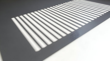 Clean, graphic shadows from Venetian blinds create a striking linear pattern on a bright, minimalist white floor or wall, evoking a sense of calm and order.