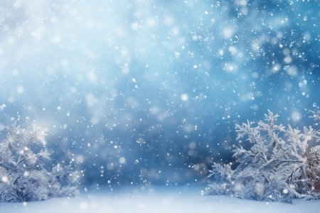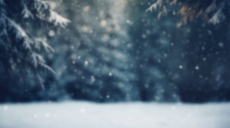 blur pine forest white snow falling background. festive winter seasonal Christmas and new year decoration concept. generative AI