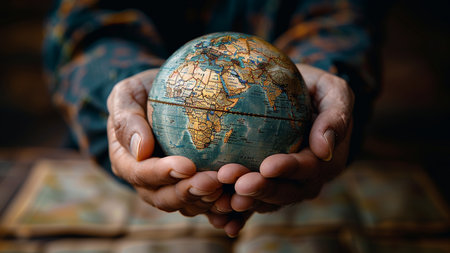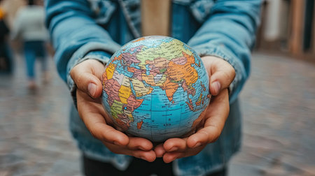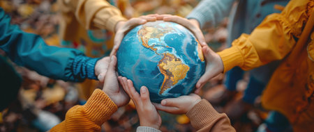 Hands from different cultures and ethnicities jointly holding the Earth, promoting diversity and unity