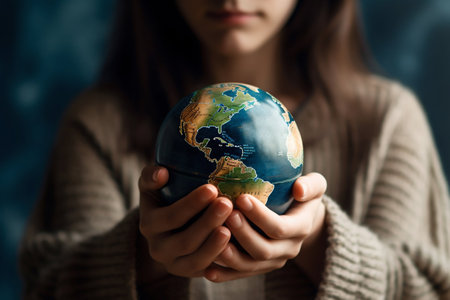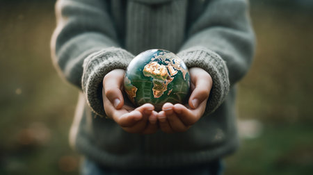 Holding a globe in two hands symbolizes the weight of global issues. The setting suggests awareness and a call to action for environmental stewardship.