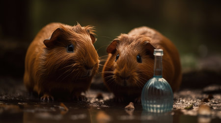Two guinea pigs drinking water from a bottle in a puddle