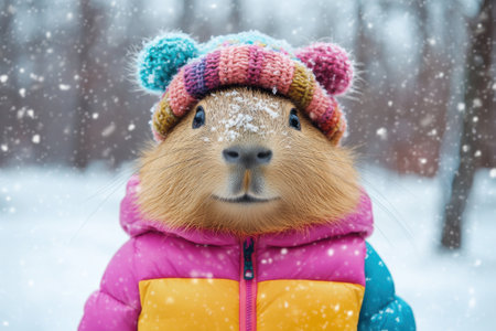 Capybara in Colorful Winter Gear Enjoying Snowy Day Outdoors Image