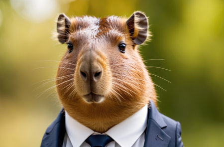 A capybara wearing a suit looks directly at the camera