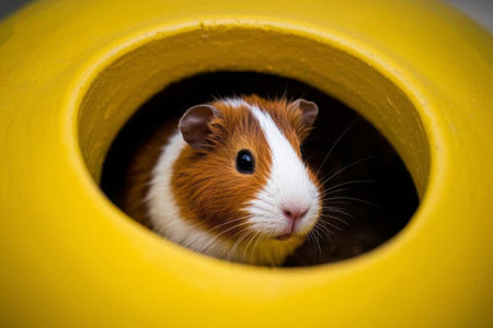 Cute guinea pig peeking out of a hole in a yellow wall