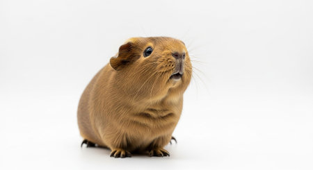 Fluffy guinea pig gazes upward, showing its adorable features and inquisitive expression on a soft white backdrop, creating a charming visual appeal.