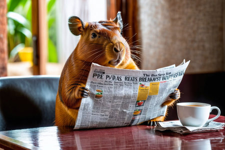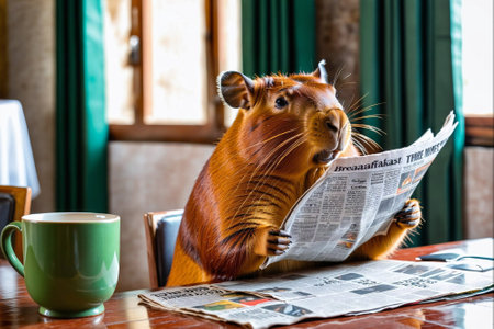 Cute rodent sitting on the table with newspaper and cup of coffee