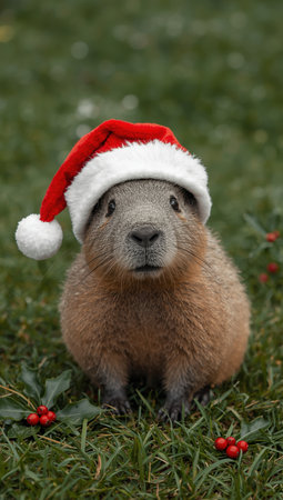 Capybara wearing a festive red and white Santa hat, sitting on green grass with scattered holly berries, symbolizing Christmas celebration and holiday cheer.