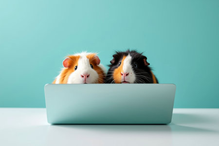 Two guinea pigs sit behind a silver laptop. One has black, orange, and white fur, while the other is white with orange patches. The turquoise background enhances the humorous and modern scene.