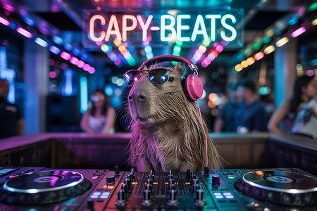 A stylish capybara DJ rocks the party with pink headphones and sunglasses, mixing tracks in a neon-illuminated nightclub. This cool and creative image captures a unique entertainment scene.