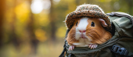 A Cute guinea pig wearing hat sitting in hiking backpack outdoors