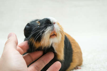 A guinea pig, a man's hand is stroking a pig, a young guinea pig. Close-up view on a light background.