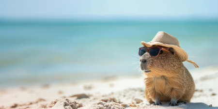 banner capybara in sunglasses and hat on the beach near the sea, looking at the camera. summer vacation by the sea with copy space