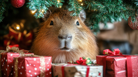 capybara under the Christmas tree with gifts