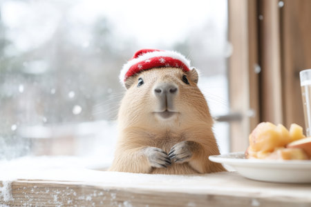 A capybara wearing a cheerful red hat sits comfortably at a wooden cafe table, looking curiously at a plate of food, while snowflakes softly fall outside the window.