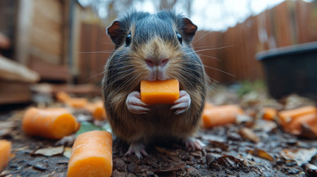 A small guinea pig with soft fur is holding a piece of carrot in its paws. The animal sits on a vibrant light blue surface, creating a cheerful atmosphere.