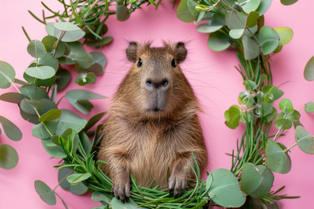Funny capybara in branches on a pink background