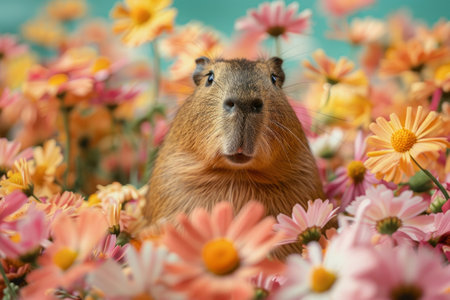 Funny capybara in colorful flowers