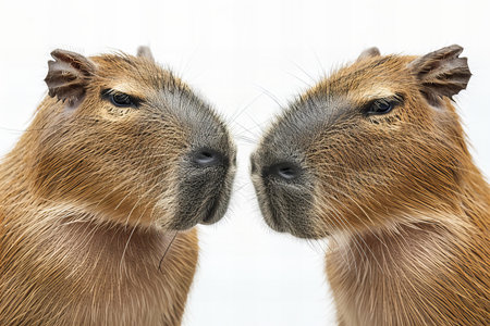 Two guinea pig heads looking at each other on a white background