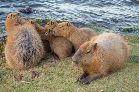 family of capybaras, Hydrochoerus hydrochaeris, feeding on grass.