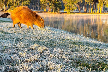 Capybara in the sunlight, in a park that can be seen in the background, on a cold morning with frost in the field.