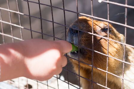 A child, a little girl, feeds the gopher through an iron grill in the zoo.